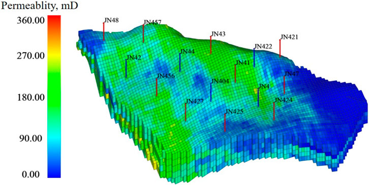 To validate the proposed methodology, a case study was conducted on a typical high water-cut sector block from the Daqing Oilfield. The sector model, shown in Figure 5, is characterized by significant heterogeneity, with permeability ranging from near zero to over 360 mD. The model is discretized into a 113 × 80 × 5 grid system, with each grid block measuring 50 m × 50 m × 4 m. The primary development pattern consists of multiple five-spot injection-production well groups (Table 1).