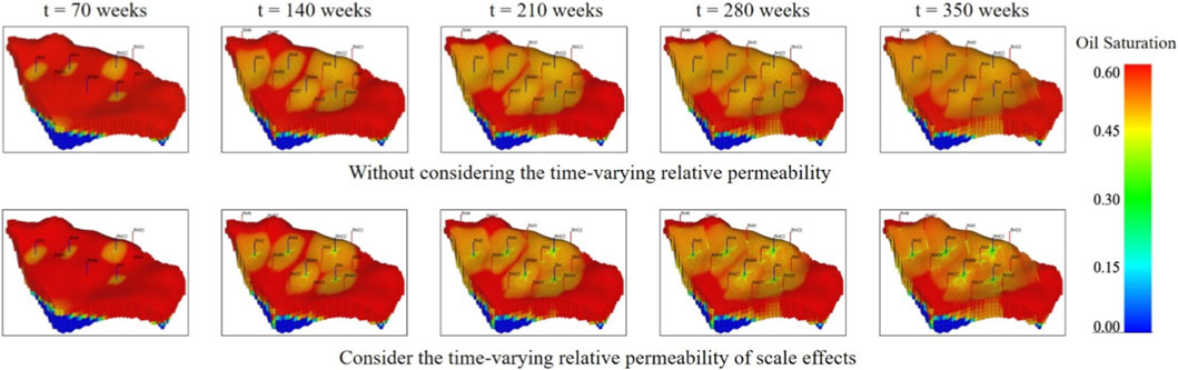 Figure 7. With and without the time-varying relative permeability of scale effects for oil saturation.