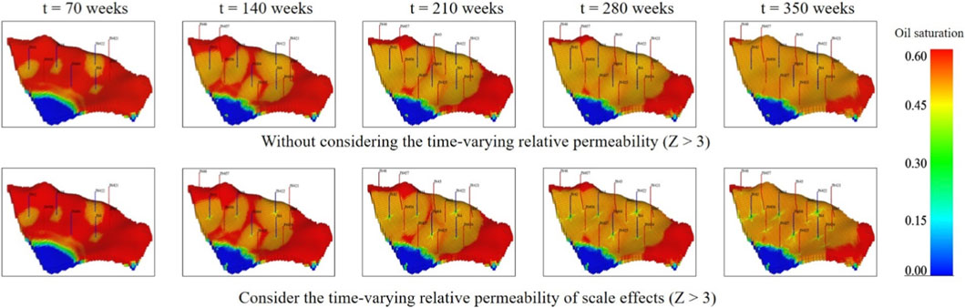 Figure 8. With and without the time-varying relative permeability of scale effects for oil saturation (Z > 3).