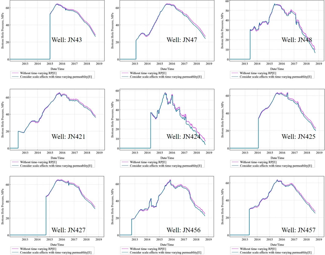Figure 11. With and without the time-varying permeability of scale effects for bottomhole pressure in wells.