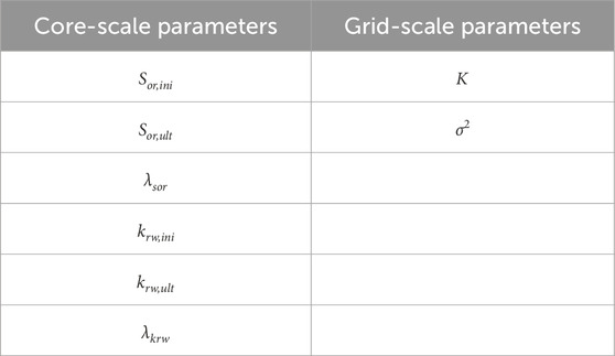 Table 2 explicitly lists the core-scale dynamic parameters (Sor,ini, Sor,ult, λsor, etc.) and the grid-scale heterogeneity parameters (K, σ2) that were derived from experimental data and geological models and used as inputs for both the conventional and our new dynamic simulation models.