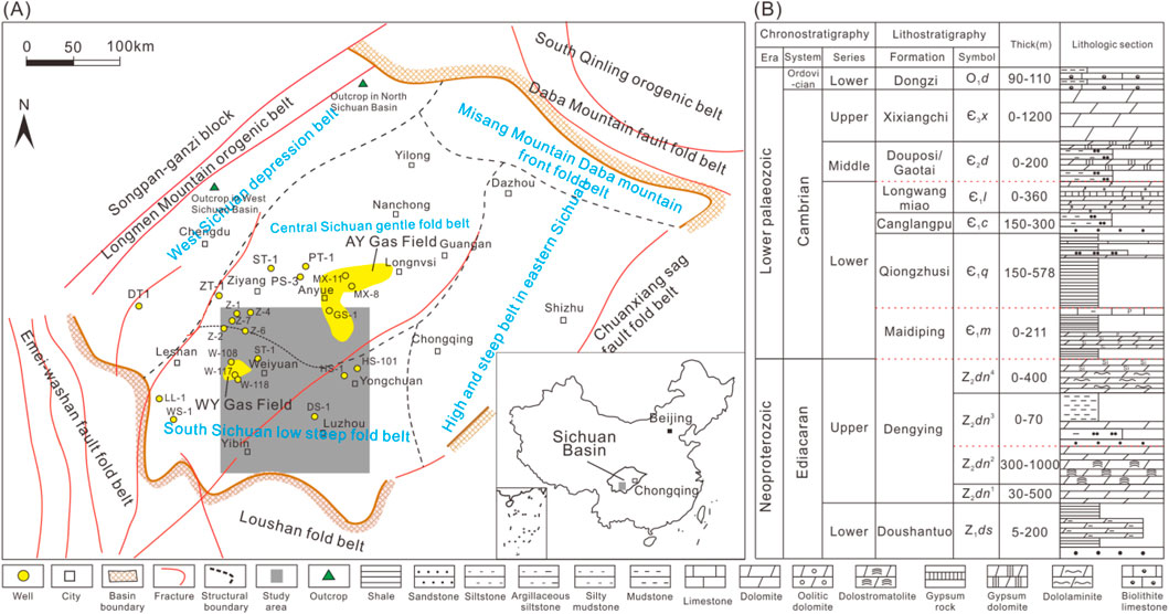 The study area is located in the Southern Sichuan Basin, including areas such as Weiyuan, Luzhou, and Yongchuan, with an area of approximately 25,000 km2. The structural location of the study area belongs to the South Sichuan low steep fold belt and southern part of Central Sichuan gentle fold belt (Figure 1A). Due to the evolution of structural conditions and sedimentary environments, strata such as the Ediacaran Doushantuo Formation and Dengying Formation, Cambrian Maidiping Formation, Qiongzhusi Formation, Canglangpu Formation and Longwangmiao Formation have developed from bottom to top in the study area (Figure 1B). According to microbial content and sedimentary structure, the Ediacaran Dengying Formation can be divided into four members (Xu et al., 2016). Among them, the second (Z2dn2) and fourth Member (Z2dn4) comprise microbial dolostromatolite and dololaminite. The first Member (Z2dn1) is mainly dolomite, and the third Member (Z2dn3) comprises shale mudtone, and siltstone. Due to the uplift movement during the Tongwan period of the Late Ediacaran, the upper part of the second (Z2dn2) and fourth Member (Z2dn4) underwent erosion and extensive karstification, forming an unconformity surface (Figure 1B). The microbial mounds and mound-shoal complexes in the second and fourth Member are effective exploration targets (Ye et al., 2024).