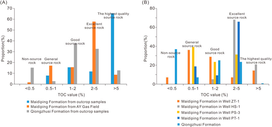Figure 2. TOC values of Cambrian Qiongzhusi and Maidiping Formation from outcrops and drilling cores. (A) TOC values from outcrop samples. (B) TOC values from drilling core samples.