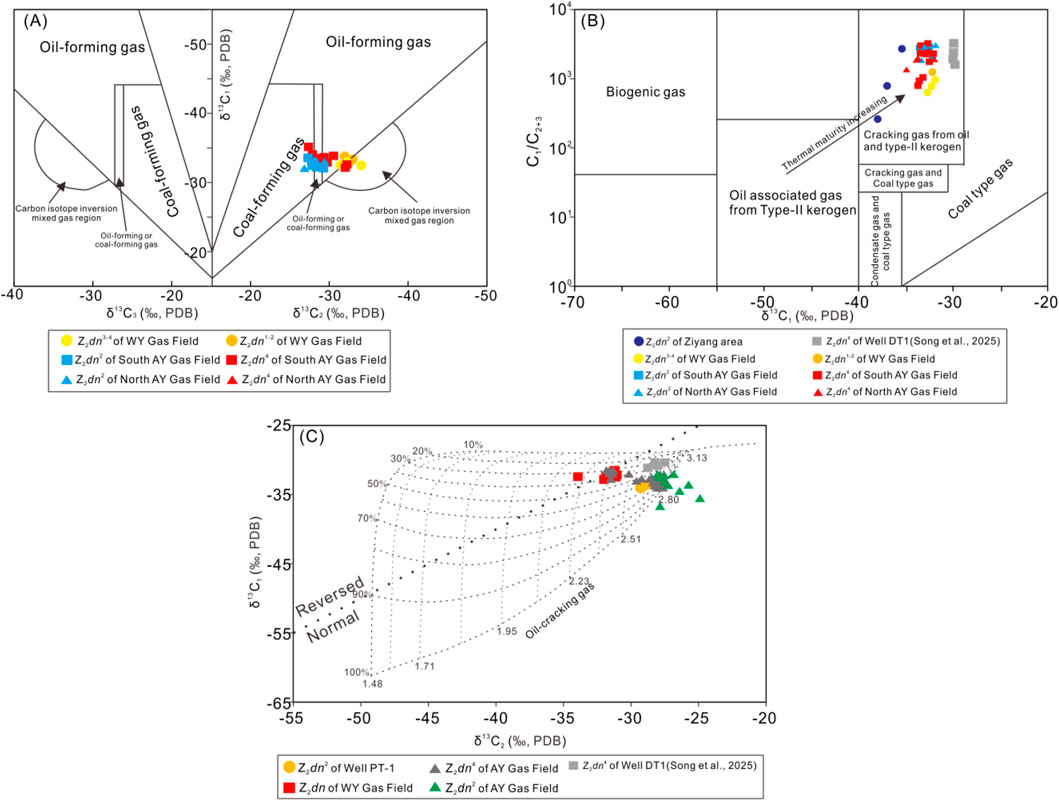 Song et al. (2025) suggested that natural gas in the Dengying Formation on both the eastern and western sides of the rift trough is dominantly oil-cracking gas. Similarly, Fan et al. (2022) reported that the AY Gas Field is mainly charged by oil-cracking gas, which is consistent with our findings. From a geological perspective, the main source rocks of the Cambrian Qiongzhusi Formation experienced shallow burial in the early stage, followed by rapid deep burial during the Late Triassic–Cretaceous. This burial history drove organic matter evolution into a gas-dominated stage. By the end of the Cretaceous, formation temperatures peaked, marking the critical period for oil cracking and gas accumulation (Shuai et al., 2023; Guo et al., 2024; Wang et al., 2024). Shuai et al. (2023) further highlighted regional differences, noting that the Ziyang area, located in structural highs, was favorable for both oil accumulation and subsequent oil-cracking gas preservation within lithologic–structural traps. In contrast, areas such as AY Gas Field, WY Gas Field and Yongchuan area, though also charged by oil and oil-cracking gas, experienced significant late-stage gas loss. In these areas, ultra-late gas release from Qiongzhusi shales provided crucial supplementary charge, ensuring high gas productivity. These insights are consistent with our conclusions on gas origins. Moreover, in the AY Gas Field, condensate shows much greater abundance and extent than normal crude oil, and its secondary cracking has supplied widely distributed gas in Dengying reservoirs (Shuai et al., 2023).