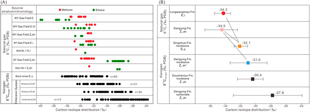 Figure 4. (A) Carbon isotope distribution map of natural gas and kerogen (modified from Wei et al., 2015), (B) Comparison of methane carbon isotopes between kerogen from different source rocks and Longwangmiao and Dengying natural gas in AY Gas Field.