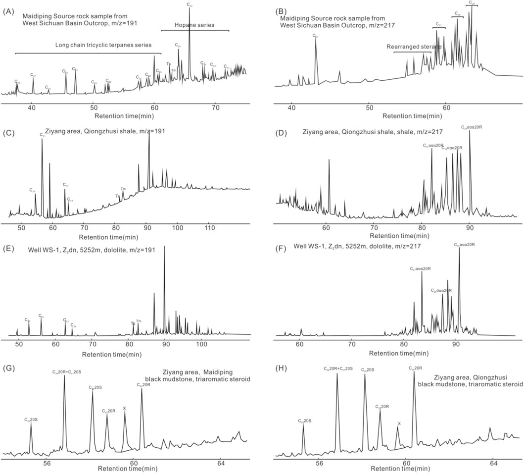 Figure 5. Distribution map of steroidal and terpenoid compounds in potential source rocks (the m/z 191 mass chromatograms are cited from Luemba et al., 2021; Liu, 2022). (A,B) Maidiping source rock from West Sichuan Basin Outcrop. (C,D) Qiongzhusi source rock from South Sichuan Basin. (E,F) Dengying source rock from South Sichuan Basin. (G) Maidiping source rock from South Sichuan Basin drilling wells. (H) Qiongzhusi source rock from South Sichuan Basin.