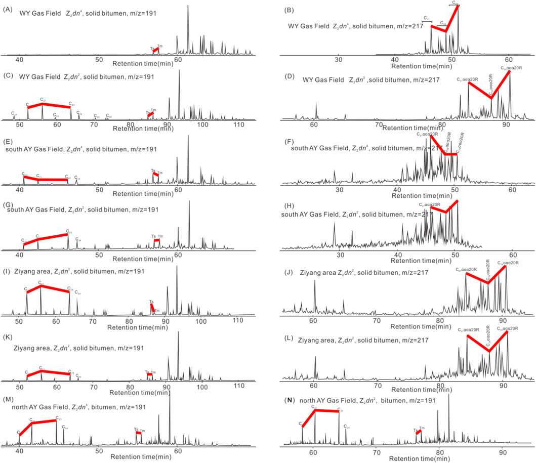 Figure 6. (A,B) Distribution of bitumen steranes (m/z = 217) and terpenes (m/z = 191) in the Dengying Formation reservoir of WY Gas Field. (C,D) Distribution of bitumen steranes (m/z = 217) and terpenes (m/z = 191) in the Dengying Formation reservoir of WY Gas Field. (E,F) Distribution of bitumen steranes (m/z = 217) and terpenes (m/z = 191) in the Dengying Formation reservoir of south AY Gas Field. (G,H) Distribution of bitumen steranes (m/z = 217) and terpenes (m/z = 191) in the Dengying Formation reservoir of south AY Gas Field. (I,J) Distribution of bitumen steranes (m/z = 217) and terpenes (m/z = 191) in the Dengying Formation reservoir of Ziyang area. (K,L) Distribution of bitumen steranes (m/z = 217) and terpenes (m/z = 191) in the Dengying Formation reservoir of Ziyang area. (M) Distribution of bitumen terpenes (m/z = 191) in the Dengying Formation reservoir of north AY Gas Field. (N) Distribution of bitumen terpenes (m/z = 191) in the Dengying Formation reservoir of north AY Gas Field.