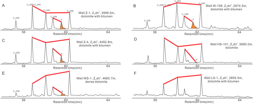 Figure 7. Comparison diagram of bitumen triaromatic steranes in Dengying Formation reservoir. (A) Ziyang area, Well Z-1. (B) WY Gas Field, Well W-108. (C) Ziyang area, Well Z-4. (D) Yongchuan area, Well HS-101. (E) Southwest Sichuan Basin, Well WS-1. (F) Southwest Sichuan Basin, Well LL-1.
