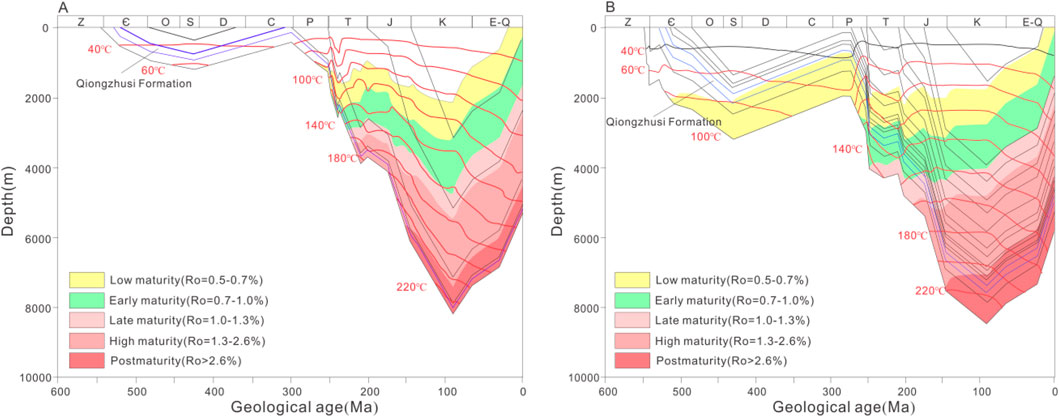 Figure 8. (A) Burial history - thermal evolution history of Yongchuan area in South Sichuan Basin. (B) Burial history - thermal evolution history of south AY Gas Field.