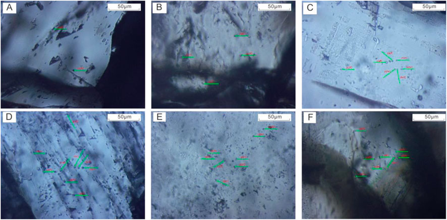 Figure 9. Microscopic characteristics of fluid inclusions in the Dengying Formation reservoir in South Sichuan Basin. (A) Well Z-4, Z2dn2, 4484 m, vapor-liquid inclusion. (B) Well Z-6, Z2dn2, 3758.31m, vapor-liquid inclusion. (C) Well Z-6, Z2dn2, 3716m, vapor-liquid inclusion. (D) Well ZS-1, Z2dn2, 5357.6m, vapor-liquid inclusion. (E) Well W-117, Z2dn2, 3177.65m, vapor-liquid inclusion. (F) Well W-113, Z2dn2, 3128.76m, vapor-liquid inclusion.