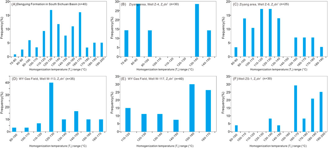 Figure 10. Homogenization temperature (Th) distribution frequency histogram of fluid-inclusions in Dengying Formation reservoir. (A) Th distribution frequency histogram of fluid-inclusions in Dengying Formation of South Sichuan Basin. (B) Th distribution frequency histogram of fluid-inclusions in Dengying 2nd Member of Well Z-4. (C) Th distribution frequency histogram of fluid-inclusions in Dengying 2nd Member of Well Z-6. (D) Th distribution frequency histogram of fluid-inclusions in Dengying 2nd Member of Well W-113 in WY Gas Field. (E) Th distribution frequency histogram of fluid-inclusions in Dengying 2nd Member of Well W-117 in WY Gas Field. (F) Th distribution frequency histogram of fluid-inclusions in Dengying 2nd Member of Well ZS-1.