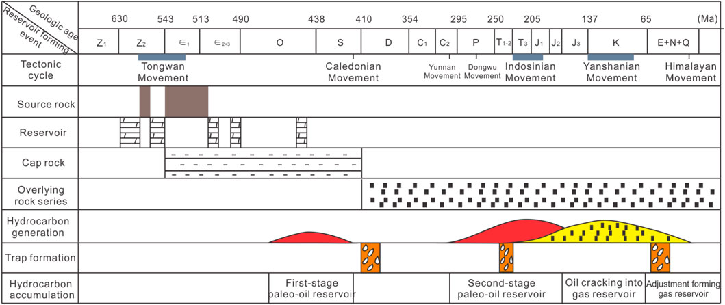 Figure 11. Schematic diagram of hydrocarbon accumulation events in the Ediacaran Dengying Formation reservoir in South Sichuan Basin.