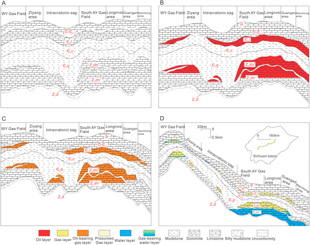 Figure 12. Evolution of hydrocarbon accumulation in the Ediacaran Dengying Formation (modified from Yang et al., 2016). (A) Ediacaran to Early Ordovician. (B) Middle Ordovician to Middle Triassic. (C) Late Triassic to Cretaceous. (D) Late Cretaceous to present day.