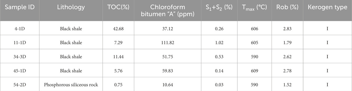 In response to the high degree of evolution of Lower Cambrian source rocks, microscopic component identification was applied to determine the type of kerogen (Pickel et al., 2017; Xu et al., 2021; Xu et al., 2025), as shown in Table 1. The sapropelite content of the nine outcrop samples of the source rocks in the Maidiping Formation ranges from 88% to 100%, with an average of 93%. The average content of exinite is 5.8%, while the content of vitrinite and inertinite is very low. The kerogen type index ranges from 89 to 100, with an average type index of 95.2. The kerogen type index of three Maidiping source rock samples from Well Z-4 ranges from 89.5 to 93, with an average type index of 94.8. It is suggested that the kerogen type of the Maidiping Formation is Type I (Cao, 1985; Dai et al., 1992). According to the rock pyrolysis data and bitumen reflectance data of five outcrop samples of Maidiping source rocks (Table 2), the maximum temperature (Tmax) of rock pyrolysis is between 590 °C and 609 °C. The bitumen reflectance Rob is between 1.52% and 2.83%, indicating that the source rock has entered over-matured evolutionary stage (Dai et al., 1992; Hou and Liu, 2011).
