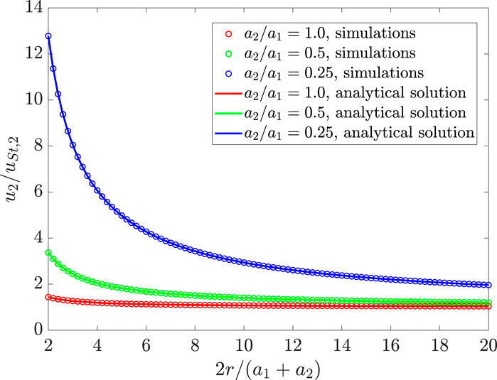 We now turn to the analysis of simulations in the bidisperse case. The normalized particle settling velocities in both individual settling and group settling cases are shown in Figure 8. For these calculations, in the individual settling case, a single particle with radius