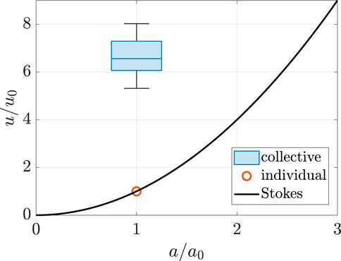 Figure 5. Monodisperse case: Particle settling velocities normalized by the particle Stokes settling velocity as function of the normalized particle size. Single particles settle according to Stokes (red circle), whereas particles settling collectively display a spread in settling velocities (boxplot). The mean value and standard deviation of the settling velocity are 6.6 and 0.7, respectively. The horizontal line in the blue box represents the median value. The volume fraction of particles is