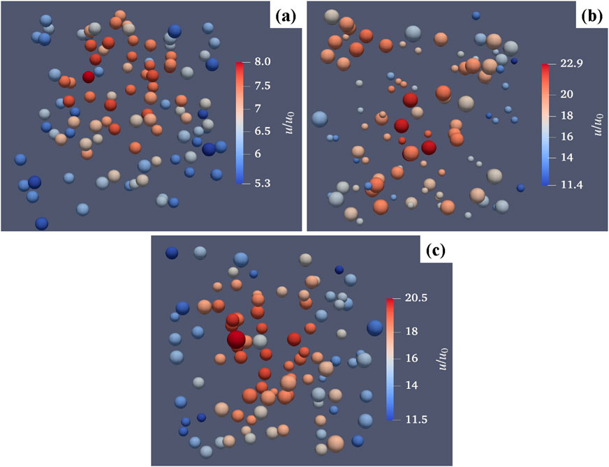 Figure 7. Example of simulated configurations for (a) monodisperse, (b) bidisperse and (c) polydisperse cases. The particles are colored according to their settling velocities (normalized by the reference Stokes velocity).