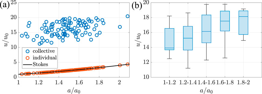Figure 9. Polydisperse case: (a) normalized particle settling velocities comparing collective and individual settling, and (b) spread of the normalized particle settling velocities per size range during collective settling.