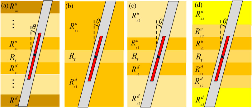 To establish an optimal computational model for ALL, this study conducted parameter optimization from both radial and longitudinal dimensions. The longitudinal dimension focused on optimizing the formation layering structure, specifically constructing an arbitrary-layer formation model and three simplified layered models: Model Vertical 3 (Model V_3), Model Vertical 5 (Model V_5) and Model Vertical 7 (Model V_7), as shown in Figures 1a–d. The core difference among the three simplified models lies in the number of layers: Model V_3 is a three-layer structure, Model V_5 is a five-layer structure, and Model V_7 is a seven-layer structure. To standardize parameter representation, the well deviation angle is defined as θ, the target layer resistivity as Rt, the resistivity of the upper (lower) jth layer of surrounding rock as