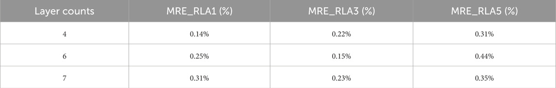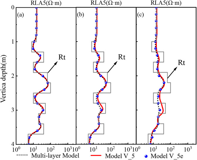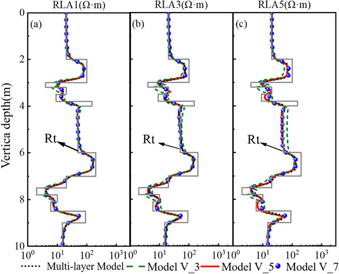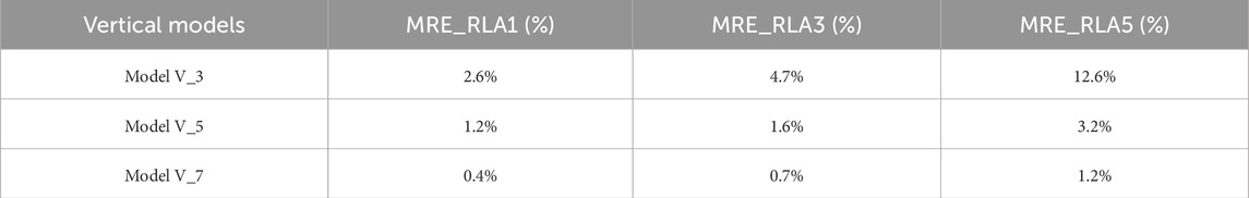 Figures 2a–c compare the relative errors between the logging responses of Model V_3, Model V_5 and Model V_7, and the original formation model under three detection modes: RLA1, RLA3, and RLA5. Table 1 shows the relative errors of the computational results for the three vertical models. Error analysis indicates that Model_V3 exhibits relatively large relative errors compared to FEM results across all three detection modes. Under the RLA1 mode, both Model_V5 and Model_V7 maintain relative errors within 2%, meeting the accuracy requirements. However, it should be noted that in actual drilling operations, if borehole enlargement occurs, the reliability of apparent resistivity data acquired in shallow detection modes (RLA1) significantly decreases, necessitating comprehensive analysis combined with caliper correction data. Under the RLA3 and RLA5 modes, Model V_7 (the seven-layer model) demonstrates better agreement with the response of the original formation, whereas Model V_5 (the five-layer model) exhibits a relative error of approximately 5% only in areas where the surrounding rock is thin. Balancing computational accuracy and model complexity, Model V_5 maintains an error level comparable to Model V_7 while reducing the number of model parameters and computational cost, offering greater value for engineering applications and advantages in computational efficiency.
