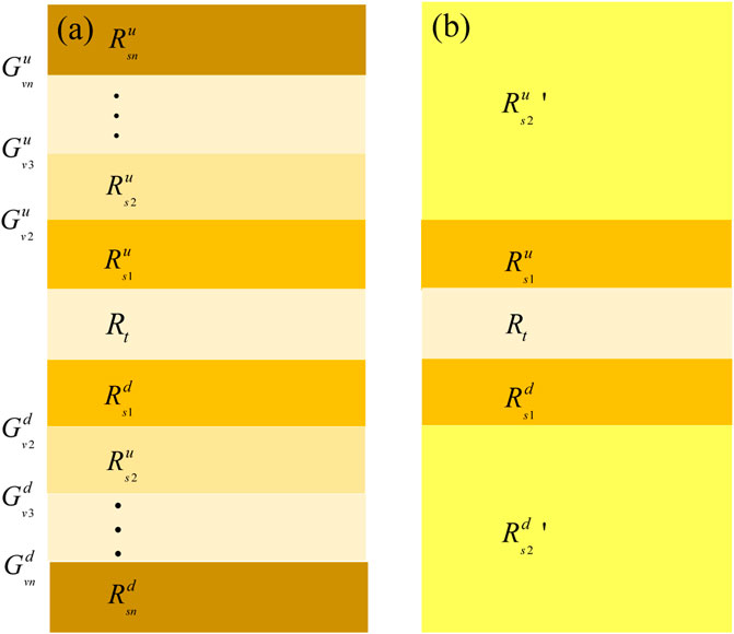 Building upon the theory of numerical geometric factors, this study proposes an equivalent method for the surrounding rocks in the five-layer model. Figure 3 illustrates the detailed process of the equivalent method for surrounding rocks, whose core lies in replacing multiple formations beyond the five layers with two formations of semi-infinite thickness. The resistivity of the equivalent formations is shown in Equation 2.