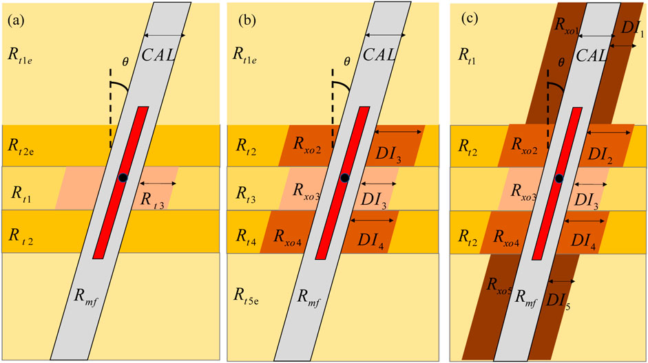 To address the optimization of formation layering parameters in the radial dimension, Figure 5 presents three computational models for comparative analysis: Model Radial 1 (Model R_1): invasion only in the target zone, Model Radial 3 (Model R_3): invasion in both the target zone and adjacent layers, and Model Radial 5 (Model R_5): invasion across all formation layers. The parameters associated with each model are as follows: The dipping angle, resistivity of the jth formation, flushed zone resistivity, and equivalent resistivity are denoted by θ, Rtj, Rxoj, and Rtje, respectively. The core of this method is to equivalent the undisturbed formation and flushed zone into one layer. The resistivity of the equivalent formations is shown in Equation 3.