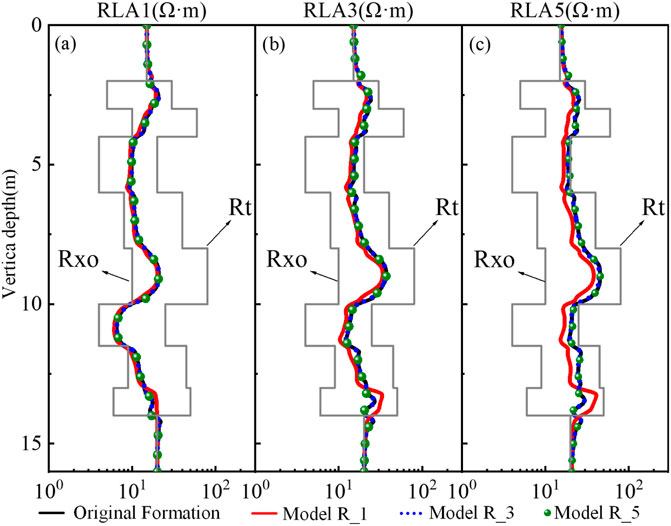 Figure 6. Simulated Array Lateralog Responses of Invaded-Layered Formations Under Different Detection Modes (a) RLA1; (b) RLA3; (c) RLA5, where the well deviations are 60°.