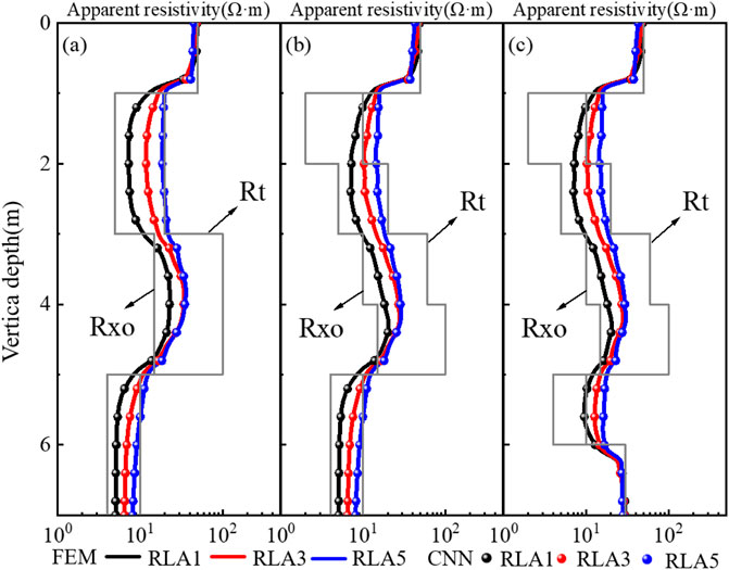 Figure 2. Array lateral log responses of two calculation models in layered medium under different detection modes: (a) RLA1, (b) RLA3, (c) RLA5, where the well deviations are 60°.