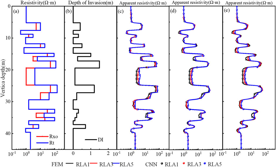 Figure 9. Simulated ALL Responses by FEM and CNN in Oklahoma Formation: (a) Resistivity; (b) Depth of invasion, where the well deviations are (c) 30°, (d) 60° and (e) 80°.