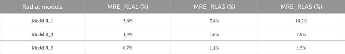 For operating modes with shallow investigation depths (RLA1), all three models accurately reproduce the formation logging responses. The deviations between the simulation results and FEM references remain minimal, meeting the accuracy requirements for shallow detection scenarios. As the investigation depth increases (RLA3 and RLA5), the simulation accuracy of Model R_1 declines significantly. This model fails to effectively represent the apparent resistivity characteristics of the original formation, and the simulation error increases progressively with depth. In contrast, the results from Model R_3 and Model R_5 remain in close agreement with the FEM solutions throughout, maintaining high simulation accuracy even under deep investigation conditions. Considering both computational accuracy and model complexity from an engineering practicality perspective, Model R_3 achieves computational error levels comparable to those of Model R_5 while incorporating a more parameter-efficient design. This reduction in the number of required parameters enhances its suitability for efficient computation and parameter inversion in subsequent engineering applications.