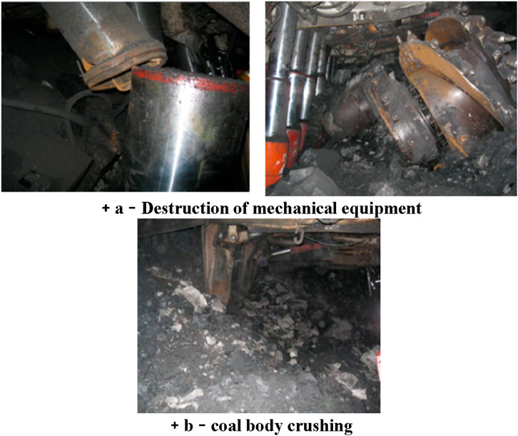Figure 1. Rockburst site conditions. (a) Destruction of mechanical equipment and (b) coal body crushing.