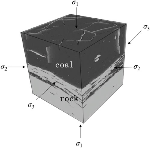 The three-way stress state of the coal–rock body without the influence of mining is shown in Figure 3.
