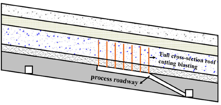 The thick and hard roof remains the main controlling factor for rockbursts in coal seam B2. Because the B2 seam is mined by top-coal caving, blasting cannot be performed directly at the working face. During mining of panel 1,121, it was found that pre-cracking without full-section roof cutting could not ensure the timely collapse of the thick-hard roof. Therefore, a process roadway was designed to conduct full cross-section roof cutting blasting, enabling real-time treatment of the thick and hard roof, as shown in Figure 6.
