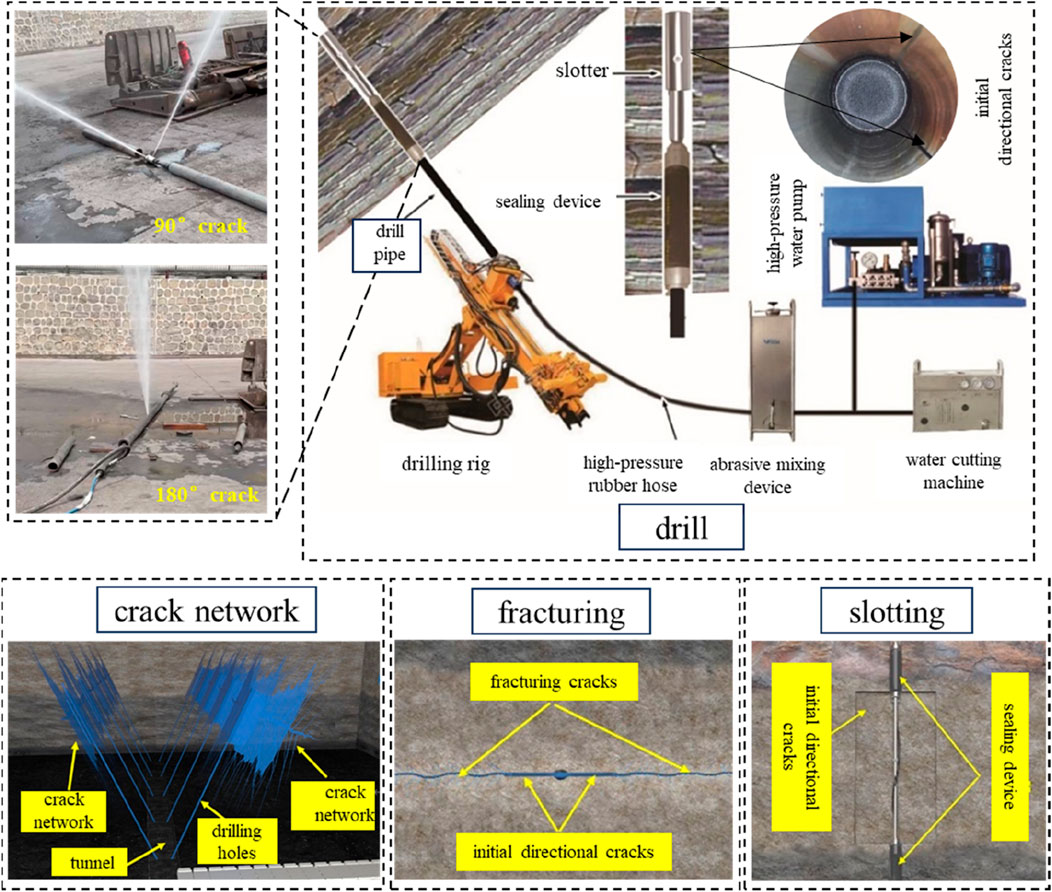 Hydraulic fracturing, originally developed for petroleum extraction, has recently been introduced for managing thick-hard roof strata. It has already been successfully applied in numerous mines across Xinjiang, Inner Mongolia, Shaanxi, and other regions, achieving notable results in controlling rockbursts and mining-induced seismicity. Compared with roof blasting, the advantages of roof axial cutting technology using abrasive jet and hydraulic fracturing are as follows: