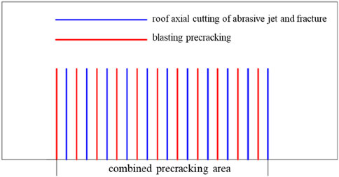 A comparative analysis was conducted in the 620–430 m section of panel I010206 to evaluate the effectiveness of a combined pre-cracking technique that integrates roof axial cutting using abrasive jet and hydraulic fracturing with blasting pre-cracking. In the combined pre-cracking area, one abrasive jet axial roof cutting hole was placed between every two blasting holes, as shown in Figure 10.