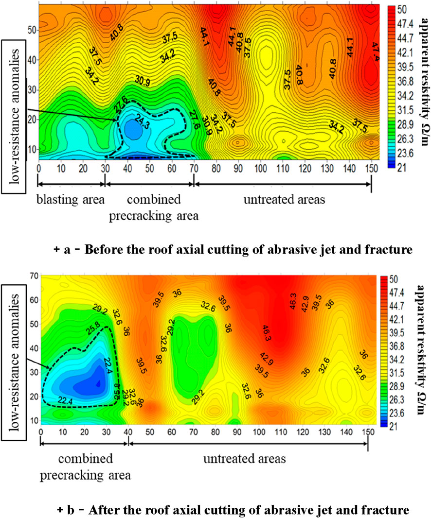 Figure 11. Transient electromagnetic detection results: (a) Before the roof axial cutting using the abrasive jet and fracture and (b) after the roof axial cutting using the abrasive jet and fracture.