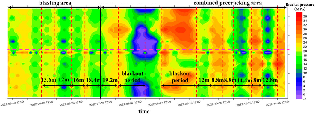 Figure 12 shows the overall support pressure evolution of panel I010206. Comparing the support pressures in the blasting pre-cracking area and the combined pre-cracking area, the latter exhibited a significant increase in support pressure at the working face, with shortened periodic weighting intervals.