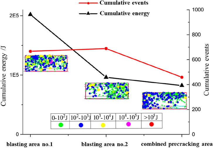 Figure 13 presents the distribution of microseismic events in the conventional blasting area and the combined pre-cracking area. A total of 459 microseismic events occurred in the combined pre-cracking area, releasing cumulative energy of 8.24 × 104 J, with an average energy of 2.52 × 102 J. In blasting area no. 1, 689 microseismic events occurred, releasing 9.62 × 104 J of cumulative energy and an average of 1.4 × 102 J. In blasting area no. 2, 667 events occurred, releasing 2.02 × 105 J of cumulative energy and an average of 3.03 × 102 J.