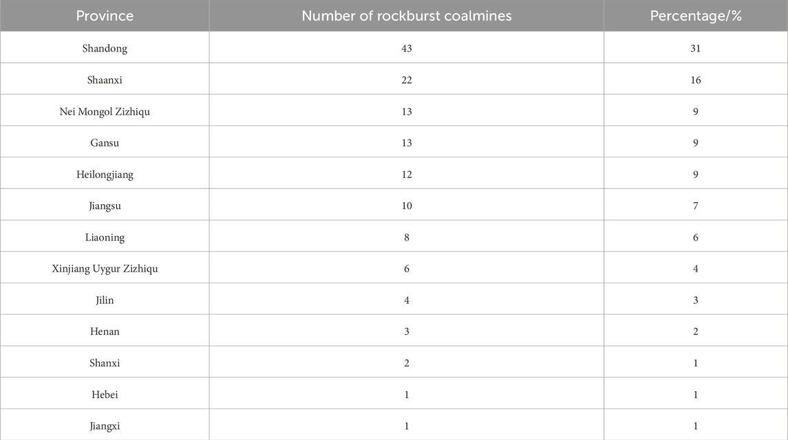 A rockburst refers to the sudden and violent failure of coal or rock caused by the instantaneous release of stored elastic deformation energy under high stress in the surrounding rock mass. This phenomenon is often accompanied by the ejection of coal and rock, loud noise, and air waves, resulting in severe destruction (He et al., 2023; Liu et al., 2024; Zhang et al., 2023). Rockburst disasters are primarily driven by geostress. As geostress increases with mining depth, rockburst hazards become more pronounced (Gao et al., 2024; Pan et al., 2024; Wang et al., 2024). The distribution of rockburst-prone mines in China is shown in Table 1.