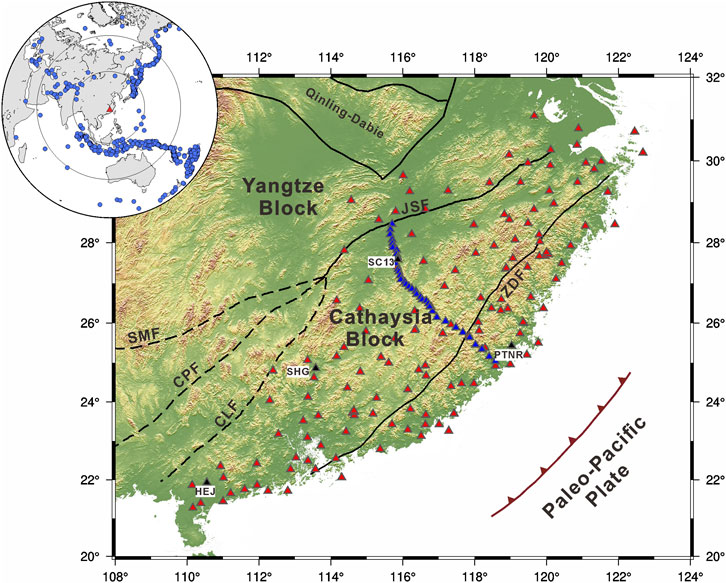 Figure 1. Tectonic map (Zhao and Cawood, 2012) and seismic stations distribution in the study area. Red triangles denote permanent seismic stations, while temporary stations are indicated by blue triangles; black triangles specifically highlight stations that are featured in Figure 2. Major faults are shown as black lines: JSF (Jiangshan-Shaoxing Fault), ZDF (Zhenghe-Dapu Fault), CPF (Chaling-Pingxiang Fault), CLF (Chenzhou-Linwu Fault), and SMF (Shizong-Mile Fault). Dashed lines delineate potential boundaries between the Yangtze and Cathaysia block within the southwestern South China block. The upper-left inset displays epicentral distributions of analyzed teleseismic events and red triangle indicates the study area.