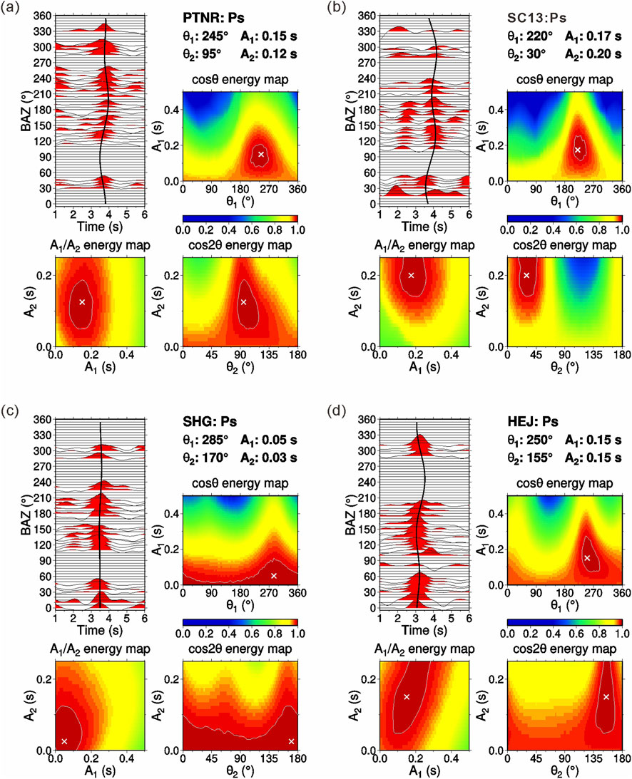 Figure 2. Harmonic fitting analysis of Pms phases recorded at four seismic stations: (a) PTNR, (b) SC13, (c) SHG, and (d) HEJ. In the receiver function profiles, black curves demarcate theoretical arrival times of Pms phases, while white crosses in the energy maps indicate optimal solution positions derived from harmonic analysis.