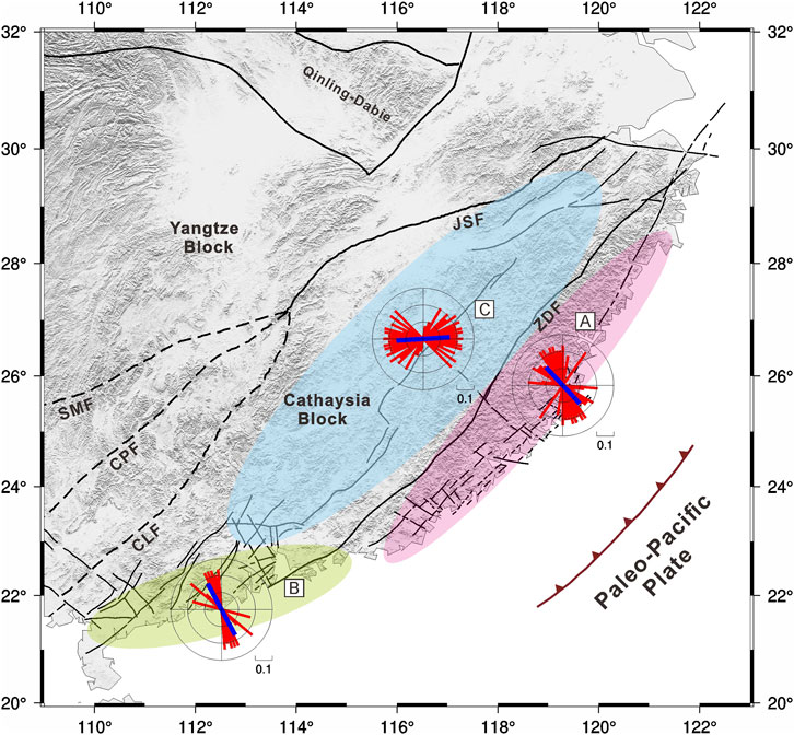 In the Cathaysia Block, the northern coastal, southern coastal, and inland regions have average delay times of 0.27 s, 0.32 s, and 0.29 s, respectively. While the average delay times across these three regions are modestly similar, the FPDs reveal striking differences. More specifically, the FPDs of crustal anisotropy display marked spatial heterogeneity along the coastal region from north to south. In the northern region, the FPDs are predominantly NW-SE, gradually transitioning to NNW-SSE towards the south. This anisotropic alignment exhibits strong coherence with the subduction trajectory of the paleo-Pacific plate. In contrast, the inland region is characterized by predominantly near E-W FPDs, yet with notable regional variations. In the southern part of this region, the FPDs are mainly near E-W and NWW-SEE, while in the northern part, they shift to NEE-SWW. Furthermore, the principal anisotropic directions in this zone are nearly orthogonal to the subduction direction of the paleo-Pacific plate.