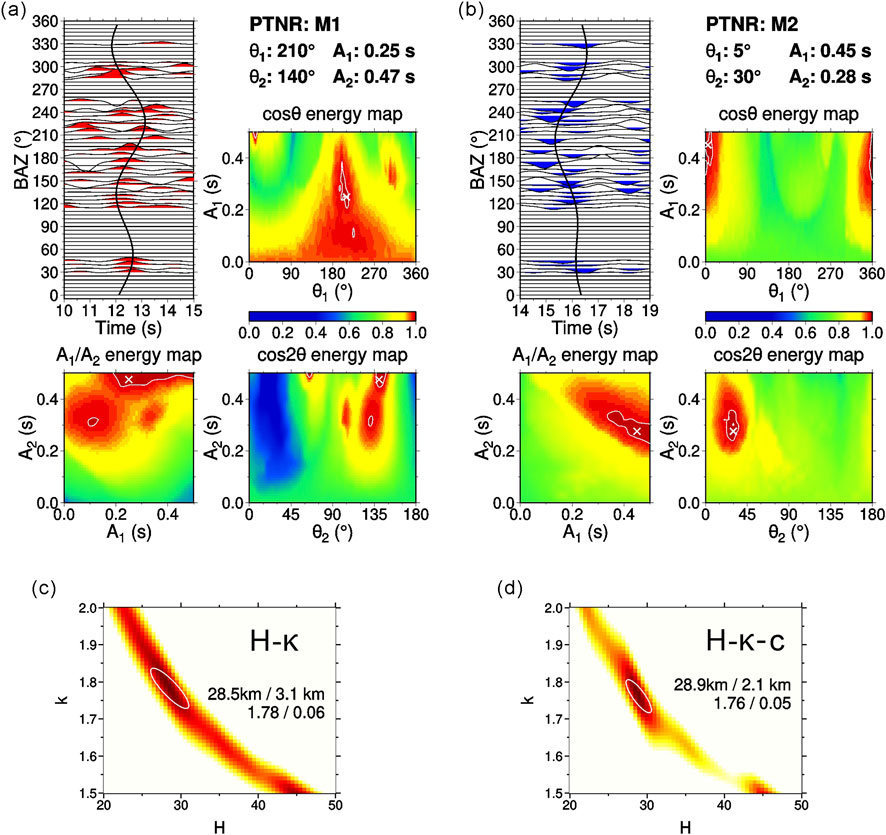 Figure 5. (a–b) Harmonic fitting of multiple-phase arrivals of PpPs (M1) and PpSs + PsPs (M2) at station PTNR, with corresponding (c–d) crustal thickness (H) and Vp/Vs ratios (κ) determinations derived from H-κ and H-κ-c stacking method.
