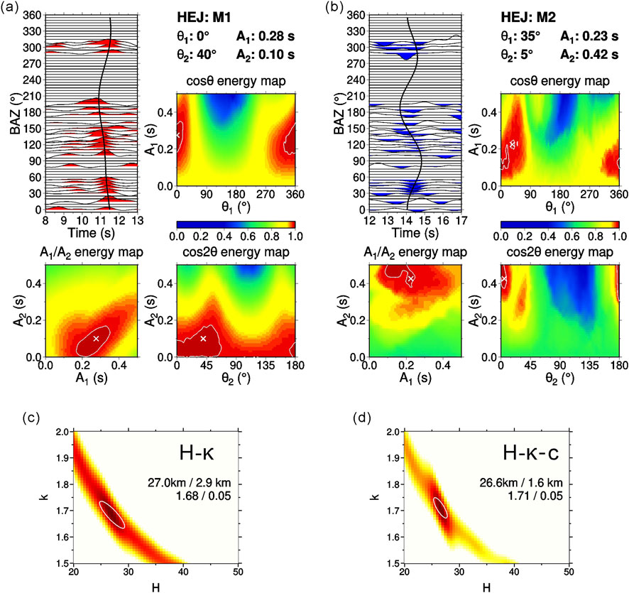 Figure 6. (a,b) Harmonic fitting of multiple-phase arrivals of PpPs (M1) and PpSs + PsPs (M2) at station HEJ, with corresponding (c,d) crustal thickness (H) and Vp/Vs ratios (κ) determinations derived from H-κ and H-κ-c stacking method."