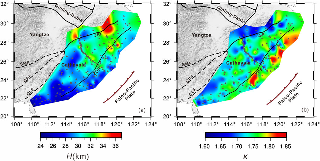Figure 7 and Supplementary Table S1 delineate the crustal thickness (H) and Vp/Vs ratio (κ) of the study area as determined via the H-κ-c stacking method. Our findings unveil marked spatial heterogeneity in both crustal thickness and Vp/Vs ratio across the Cathaysia Block.