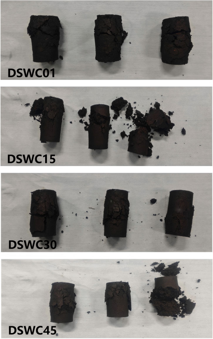 The compressive strength test results for the artificial blockage samples are summarized in Table 1 and Figure 5, with photographs of the post-test specimens shown in Figure 4. As expected, both the sample density and compressive strength exhibit a clear increasing trend with higher applied stress levels during sample preparation. Correspondingly, the slope of the force-displacement curve prior to the peak—representing the compressive elastic modulus—also increased significantly.