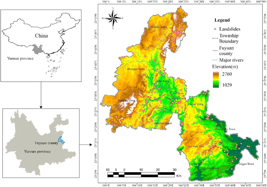 Earth functions as a complex dynamical system governed by continuous geological processes that manifest as diverse natural hazards (Zhang et al., 2024). Among these phenomena, landslides represent one of the most pervasive and destructive geomorphic events, formally characterized as gravitationally driven mass movements of rock, soil, or debris along pre-existing or nascent failure surfaces (Hungr et al., 2014). Globally, these events cause >4,000 fatalities annually and incur economic losses exceeding US$4 billion, with disproportionate impacts on mountainous and hillslope communities (Gariano and Guzzetti, 2016). Southwestern China’s tectonically active convergence zone—encompassing Yunnan and Guizhou provinces—experiences elevated landslide susceptibility due to neotectonic forcing, extreme topographic gradients, heterogeneous lithologies, and high-intensity monsoonal precipitation (Ye et al., 2024; Zhang et al., 2023). According to an official report from China’s Ministry of Emergency Management, in the first half of 2025, geological disasters occurred frequently in the southwestern region. A total of 74 dead and missing persons were reported due to geological disasters in the four provinces (autonomous regions) of Yunnan, Sichuan, Guizhou, and Tibet, accounting for 88.1% of the national total. Nearly 200 houses collapsed, over 900 houses were damaged, and the direct economic losses amounted to 280 million yuan.