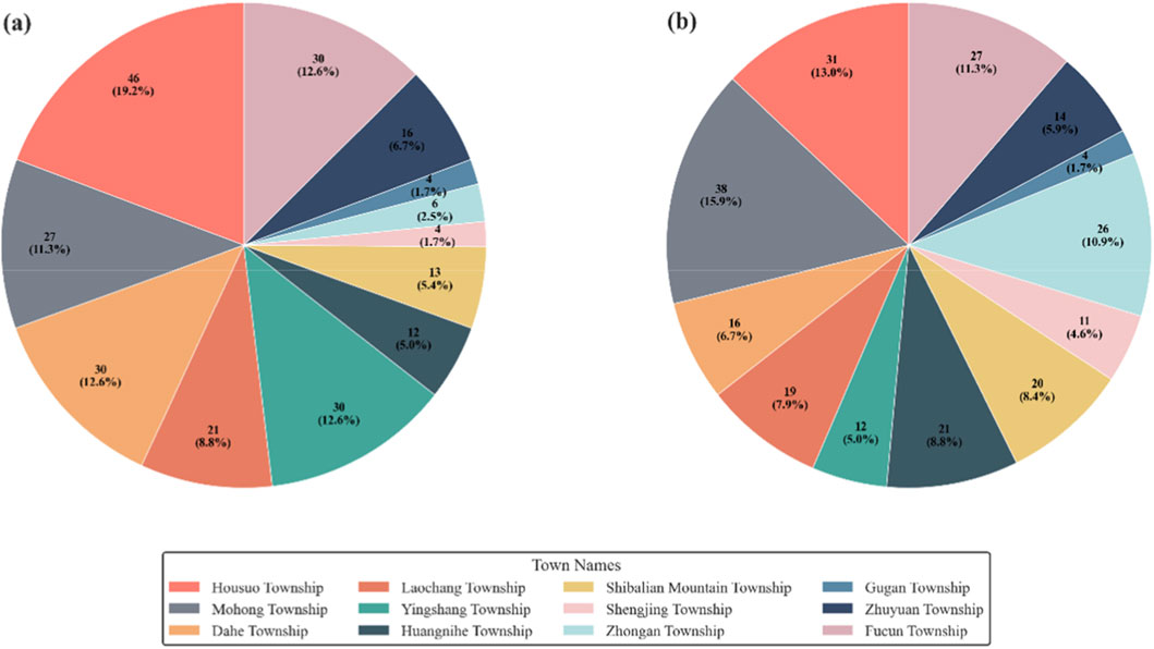 The landslide disaster inventory is a critical component of Landslide Susceptibility Mapping, providing essential data support for model training and prediction. Through field surveys and historical data analysis, it was found that landslides in Fuyuan County predominantly occur in rock masses, Quaternary soil layers, and residual slope deposits, controlled by weak surfaces or joint fractures, exhibiting characteristics of “numerous points, wide coverage, and uneven distribution.” As shown in Figure 2, among the 12 townships in the county, Zhongan Township, Shengjing Township, and Gudan Township have fewer disaster points, while the other townships show more concentrated distributions. Landslides mostly occurred between 2000 and 2023, with June to September being the peak period. Approximately 50% of landslides are located in or near fault zones or stratigraphic contact zones, influenced by tectonic activities, resulting in poor rock mass integrity, fragmented rocks, well-developed joints, and thick weathered soil layers, which provide favorable conditions for landslide formation. Fuyuan County is rich in coal resources, with about one-quarter of its land area being coal-rich zones. A total of 186 coal mine shafts with a history of mining or still in production were documented, and mining activities have further exacerbated landslide risks.