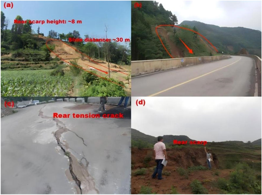 Figure 3. Characteristics of landslides in the study area: (a) Shishanjiao landslide, (b) Fudi road landslide, (c) Abainuo landslide, (d) Nazuo landslide.