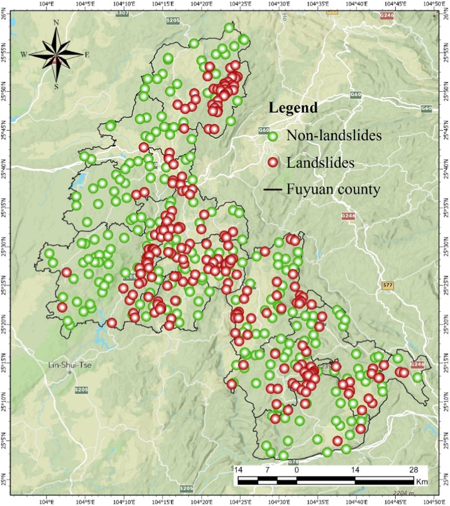 To effectively address the issues of class imbalance and spatial autocorrelation, this study employed a constrained random sampling method based on a GIS platform to systematically construct a balanced training dataset. Following established practices in landslide susceptibility mapping (Zhao et al., 2021; Guo et al., 2023), 239 non-landslide points were selected from geologically stable units in the ArcGIS environment to match the quantity of landslide points. The specific sampling constraints included: 1) spatial distribution uniformity constraint, ensuring sufficient dispersion of sample points in geographical space to reduce spatial autocorrelation effects; 2) geological environment matching constraint, maintaining comparability between non-landslide and landslide points in the distribution of key environmental factors (e.g., elevation, slope, lithology); and 3) stability verification constraint, confirming through remote sensing time-series monitoring and verification with geological reports that all selected areas have remained stable with no landslide records since official documentation began. This systematic sampling strategy not only effectively balanced the class distribution but also significantly reduced spatial dependency interference during model training, establishing a solid data foundation for developing a robust landslide susceptibility model. The spatial distribution of the ultimately adopted landslide and non-landslide points is shown in Figure 4.